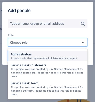 Enter the email of a team member in the search box, then select Service Desk Team in the Role dropdown list.