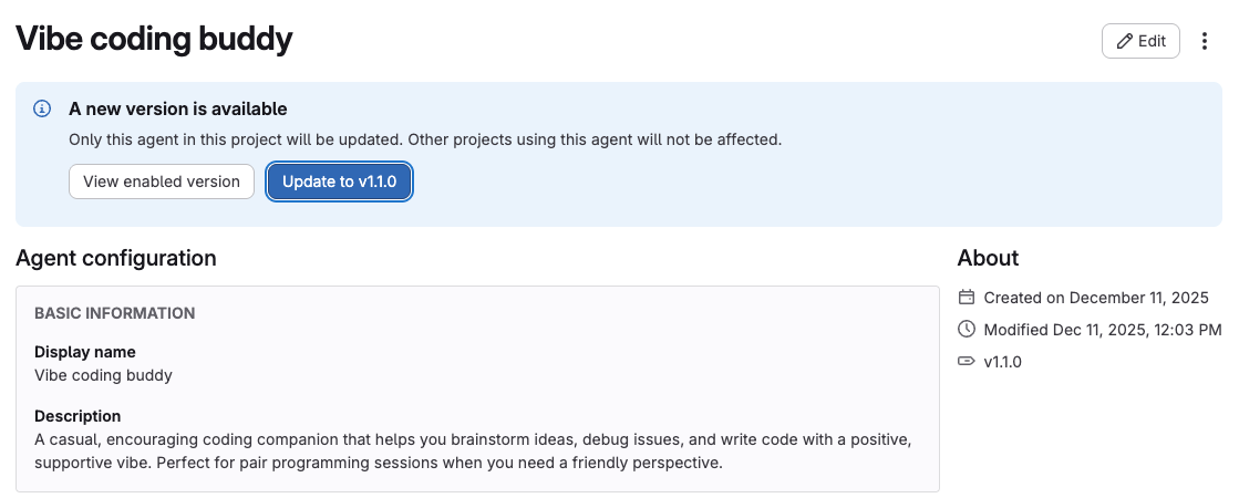 GitLab now ensures the stability and predictability of your AI-powered workflows by pinning any agent or flow enabled from the AI Catalog to its specific version within your project. This allows you to thoroughly test and validate new versions before choosing to upgrade. Learn more here.